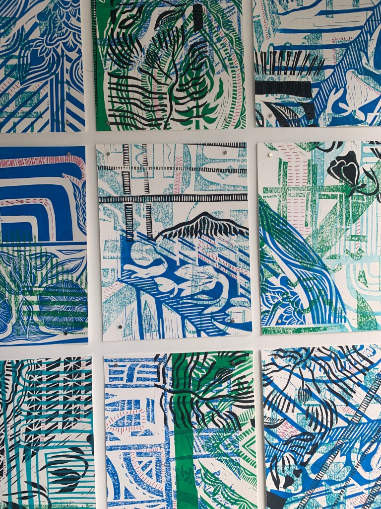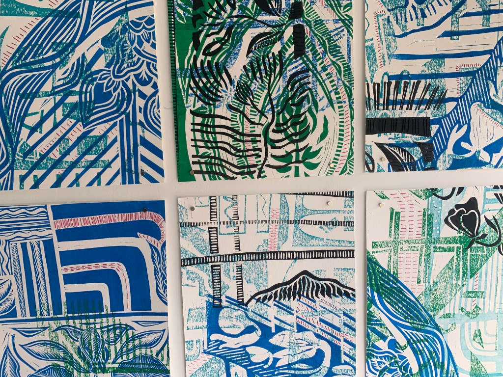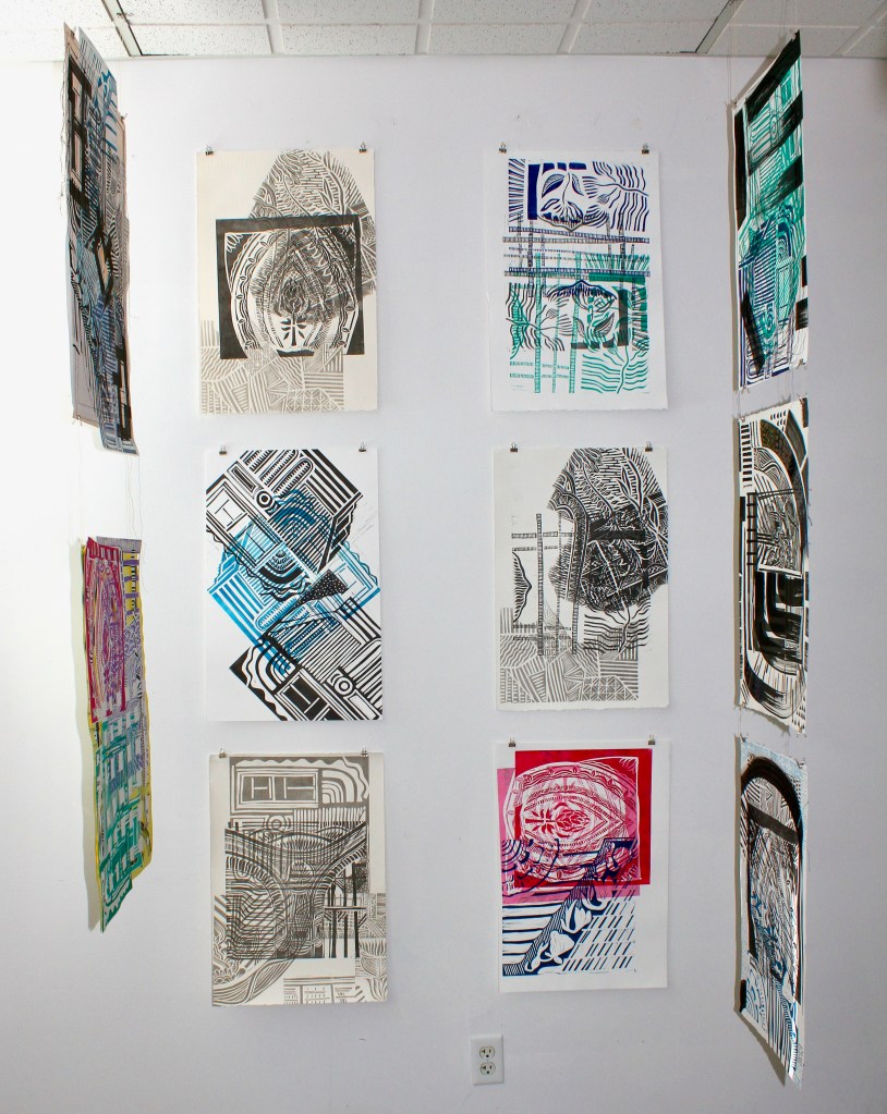 Printing from my archive, 2023, Lino printing and cotton thread. Each 8 x11 inches. On Show at Rebirth Group Show at Wave Collective Gallery, San Francisco, CA, May – June 2023